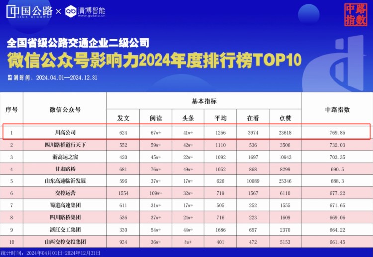 1月12日,由《中国公路》杂志社策划、制作的全国省级公路交通企业微信影响力2024年度榜单TOP10,重磅揭晓。