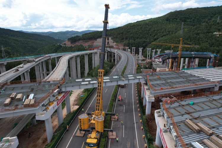 7月3号11时,广绵扩容项目LJ1标周家河枢纽上跨广南高速涉路8片钢箱梁顺利吊装完成。此次周家河枢纽主线特大桥采用35m跨径钢混组合梁上跨广南高速,与广南高速斜交角分别为 67°/68°,现场采用600 吨汽车吊进行吊装。