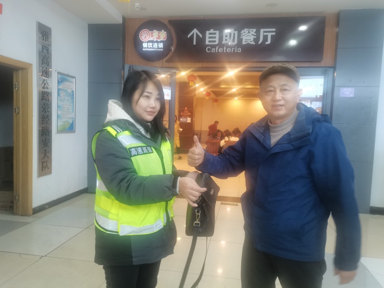 2月3日,雅西公司荥经服务区工作人员在日常巡查时,看到餐厅的椅上有一个女士挎包,四周无人,便立刻通过广播寻找失主,同时调取监控录像,发现该背包的主人已驾车驶离服务区。为尽快联系失主,服务区工作人员决定从包内查找信息,打开包发现包内装有现金5305元、两张身份证、一张社会医疗保障卡和6张银行卡,服务区工作人员通知高速交警立即联系失主。10分钟后失主联系工作人员,自己已在返回服务区的路上,服务区工作人员一边安抚王女士,一边告知她包已妥善存放。40分钟后,王女士到达荥经服务区,看见自己的包完好无损保存在服务区办公室里,她喜极而泣,表示被服务区管理人员拾金不昧的善举感动,当场拿出500元作为酬谢并写下感谢信。服务区管理员婉言谢绝,同时提醒王女士今后要注意带好随身携带的贵重物品,避免丢失。