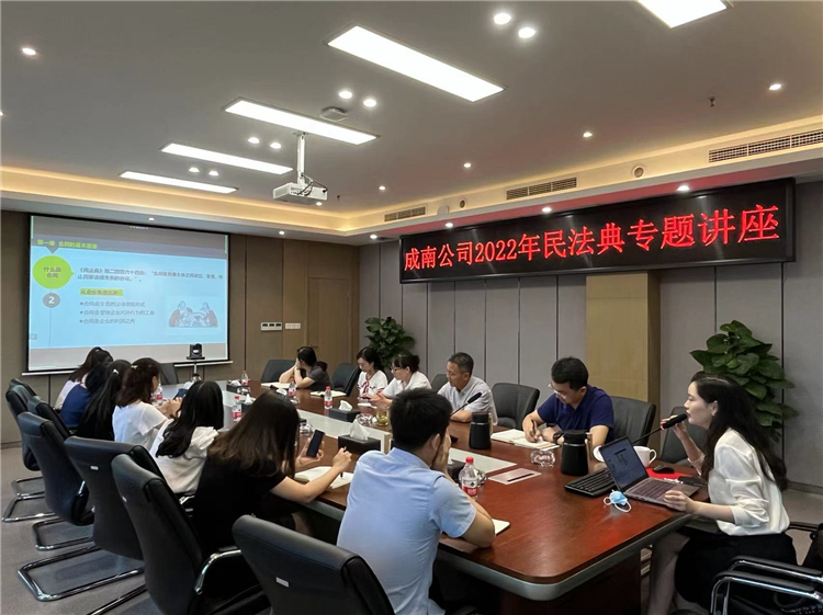 2022年6月22日,成南公司组织开展民法典专题讲座。公司各管理处处长、科长(主任)、站长、大队长,各部门负责人、各业主代表处处长和员工代表共计70余人通过面授及视频方式参加培训。