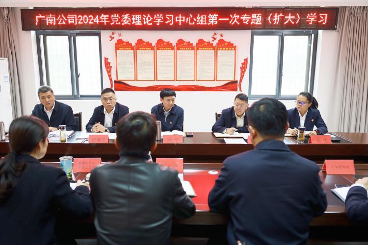 2024年3月20日,广南公司党委召开2024年党委理论学习中心组第一次专题学习(扩大)会。会议由公司党委书记、董事长梁平主持,公司领导班子全体成员、各部门、各管理处负责人参加会议。