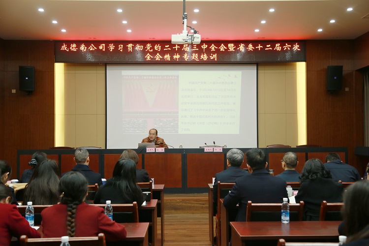 11月19日,成德南公司举办学习贯彻党的二十届三中全会暨省委十二届六次全会精神专题培训会,邀请四川师范大学马克思主义学院院长陈驰作专题宣讲。公司党委副书记、董事、总经理杨勇主持会议,领导班子成员、中层干部、全体党员共90余人通过“线上+线下”会议的形式参加学习。