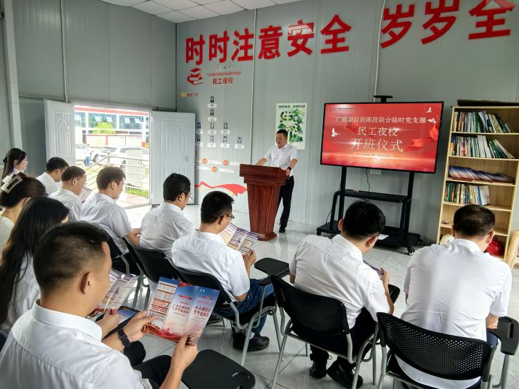 7月9日,广绵项目剑阁段联合临时党支部成功举行民工夜校开班仪式。广绵公司党委委员、副总经理、广绵项目临时党总支书记徐建平参加并致辞。