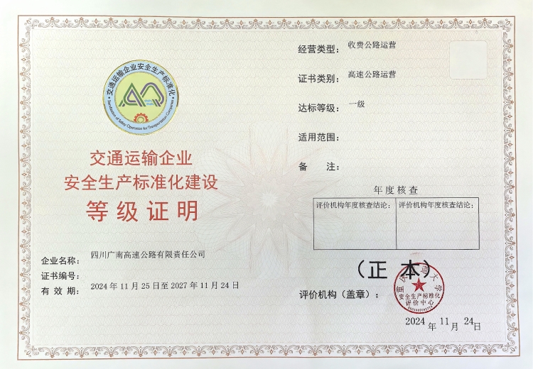 为深入学习贯彻党的二十大精神、党的二十届三中全会、省委十二届六次全会精神,积极响应落实上级党组织关于开展“党建引领·扛旗争先”专项行动的总体部署要求,以广南公司党委关于开展“瞄定目标,鼓足干劲,打赢岁末收官战”专项行动号召为指引,经过积极努力和高效协同,11月28日,广南公司成功获取交通运输企业安全生产标准化一级达标证书,本次一级达标创建为广南公司筑牢安全根基、提升运营品质再添坚实保障。