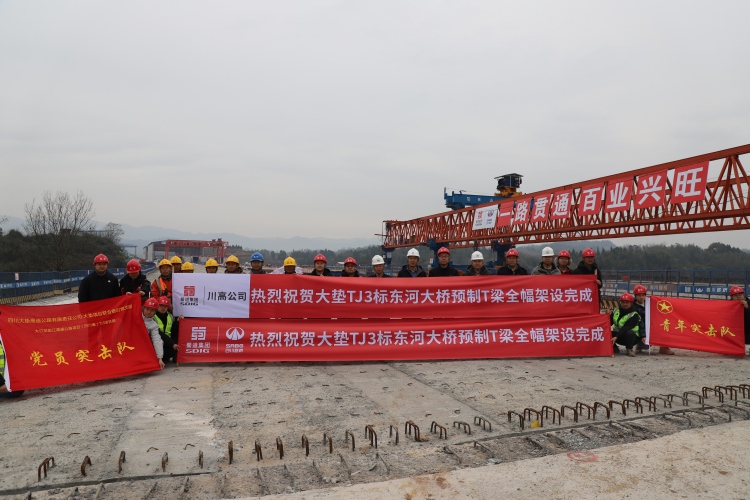 1月29日,大垫高速TJ3标东河大桥预制T梁全幅架设顺利完成,实现双幅贯通。这标志着项目桥梁工程建设取得关键性突破,全面迈入桥面施工新阶段,为实现2026年一季度“开门红”奠定了坚实基础。