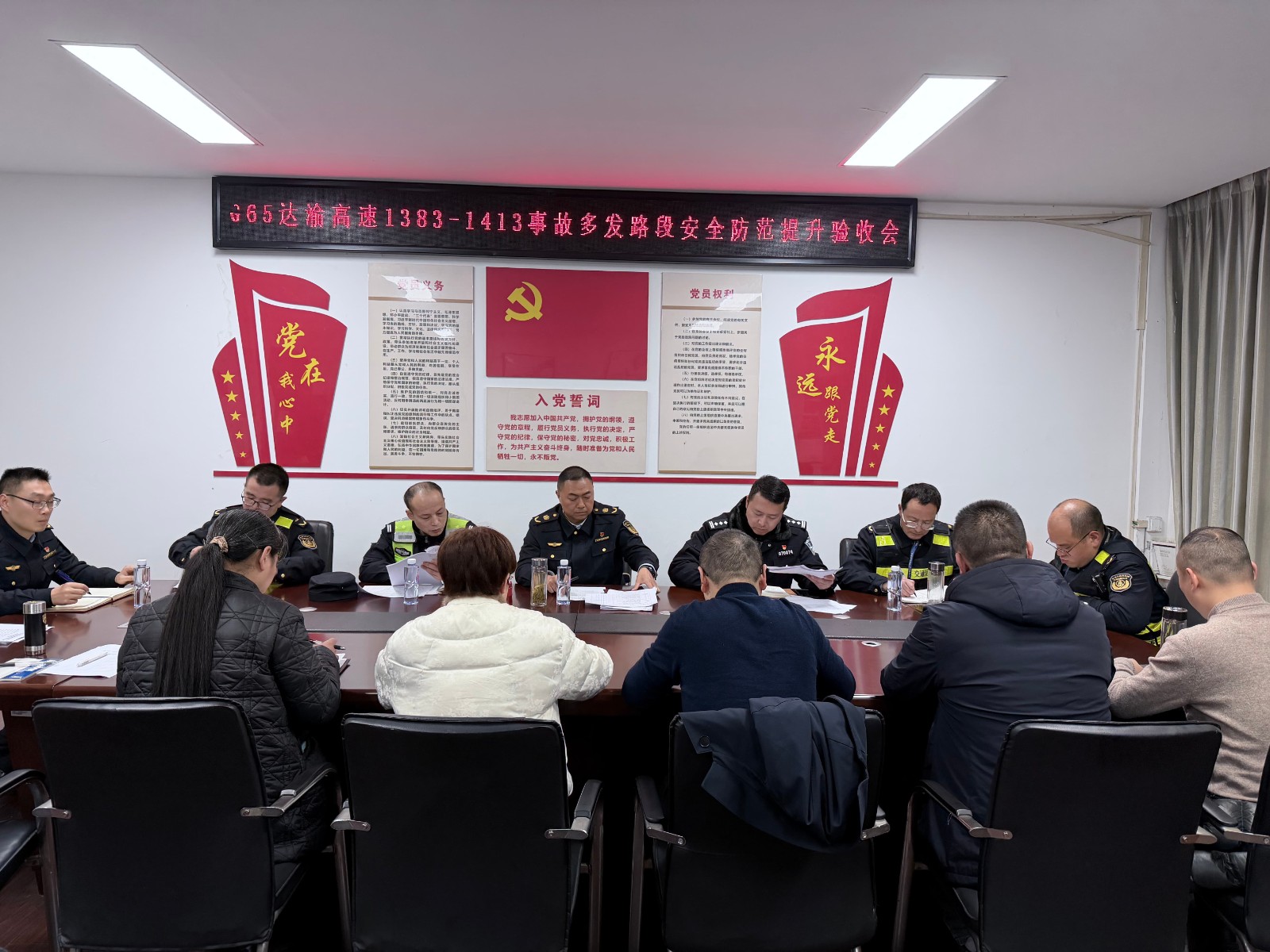 验收采取“现场核查+座谈交流”相结合的方式,严格按照“联合排查、方案会商、分责治理、评估验收”的原则开展。验收组实地检查了道路安全设施,查阅了整改台账与相关数据,重点对护栏提质升级、标志标线优化、智能监控布设等关键整治内容进行了检查,并详细评估了“一点一方案”精细化治理成效。随后,在大竹服务区召开验收会议,“一路三方”一致认为,该路段通过防护设施提升、指路诱导系统优化、智能预警设备增设等一系列整治措施,该路段实现了交通安全设施从“有”到“优”的提质升级,本质安全水平和事故主动防范能力得到显著增强。