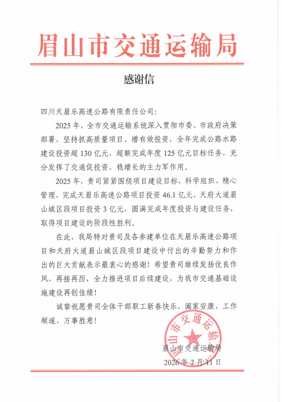 新春启新章,捷报传佳音!2月12日,天眉乐公司接连收到四川省交通运输厅与眉山市交通运输局发来的表扬信和感谢信,省、市两级交通主管部门对公司2025年在天眉乐高速项目建设、投资攻坚、质量管控中的突出贡献给予充分肯定与高度赞誉,为全体建设者送上了一份沉甸甸的“新春贺礼”!
