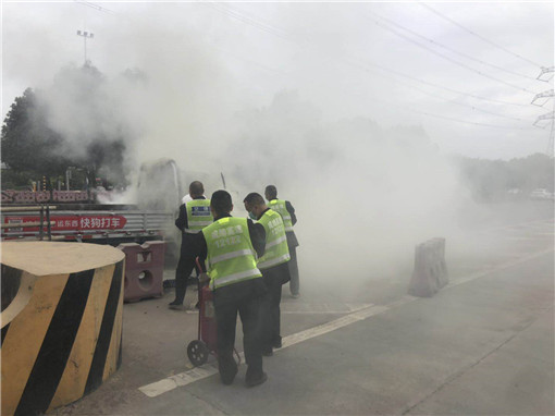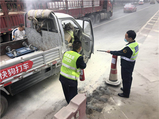 2020年4月20日,在成绵高速新都北收费站出口9#车道与货运大道的中间,一辆车牌号为川A的小型货车发生了自燃,并一直从车里往外抛洒物品。当班收费员闻到一股刺鼻的烧焦味,出亭查看时发现火苗已经从车内窜出,立即报告站长、班长,并同其他同事一起拿出灭火器参与救火。由于发现及时,经过大家共同的努力很快将火全部熄灭,紧接着指挥交通协助司机把车子转移到安全的道路旁边。