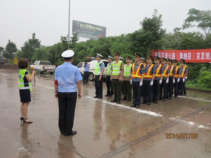 7月3日上午,川南片区公司下属的泸州管理处,联合隆纳交警大队、执法六大队及4家日常养护单位及社会车辆救援单位,在G76厦蓉高速公路隆纳段泸州西服务区(模拟场地)冒雨举行突发地质灾害应急抢险演练。